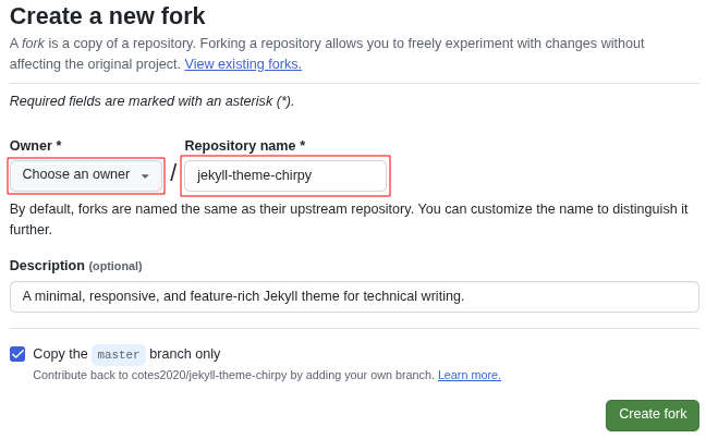 jekyll-theme-chirpy대신에<username>.github.io를 입력해야 합니다. 이때,<username>대신에 자신의GitHub username을 소문자로 입력해주셔야 합니다. 왠만하면Owner과 동일합니다.
