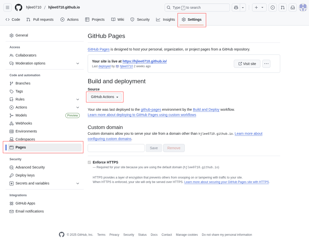 GitHub Actions를 사용하여Repository를 배포할 수 있도록 설정합니다. 아래의 그림에서처럼 붉은 박스를 따라 Settings > Pages > Build and deployment > Source > GitHub Actions와 같이 설정해줍니다.