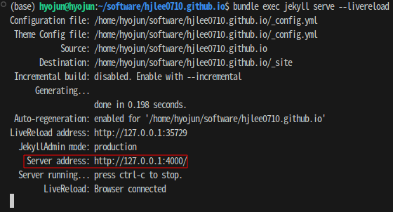 bundle exec jekyll serve아래 그림의 붉은 박스로 표시한 주소(