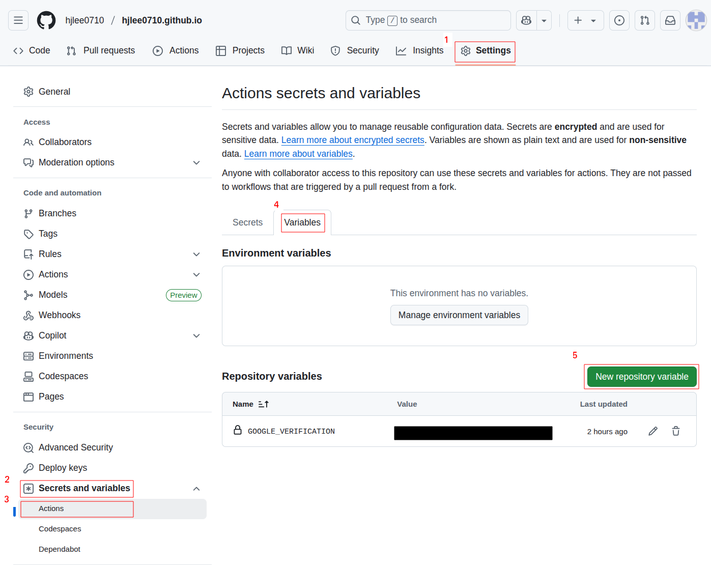 메타태그를_config.yml에 입력해야 합니다. 하지만,메타태그를 그대로_config.yml에 입력하면 추후GitHub에 업로드하면서메타태그가 노출됩니다. 이를 방지하기 위해서GitHub Actions의Repository Variables를 등록해주도록 하겠습니다.